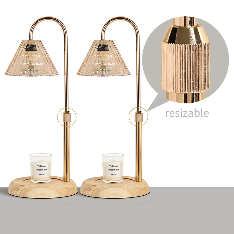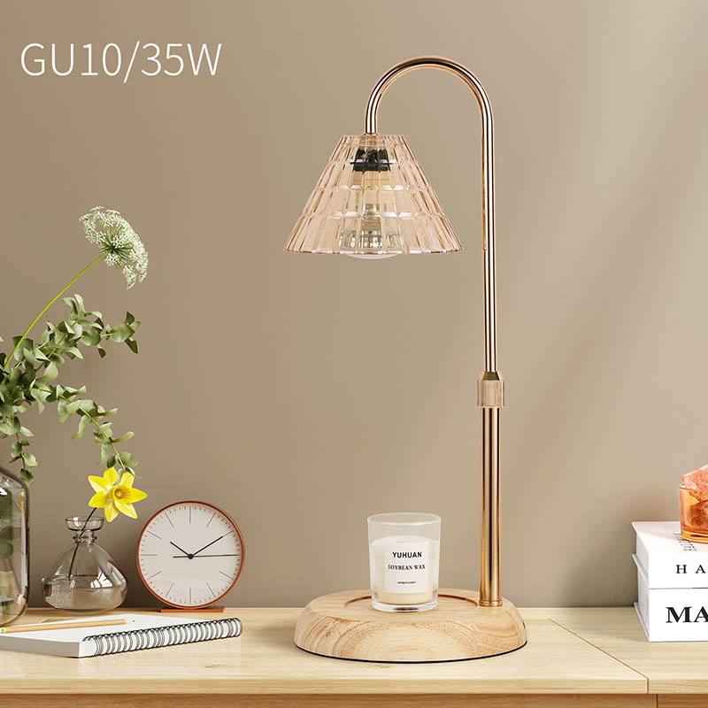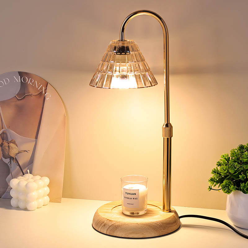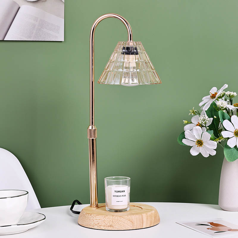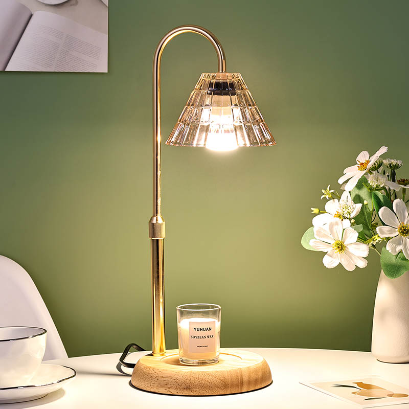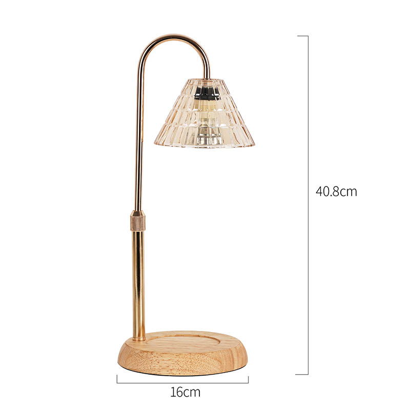 چراغ رومیزی شید شیشه ای با تنظیم ارتفاع یک سبک طراحی سنتی است که از یک لامپ سنتی با پایه چوبی و یک پایه چراغ فلزی طلایی تشکیل شده است.