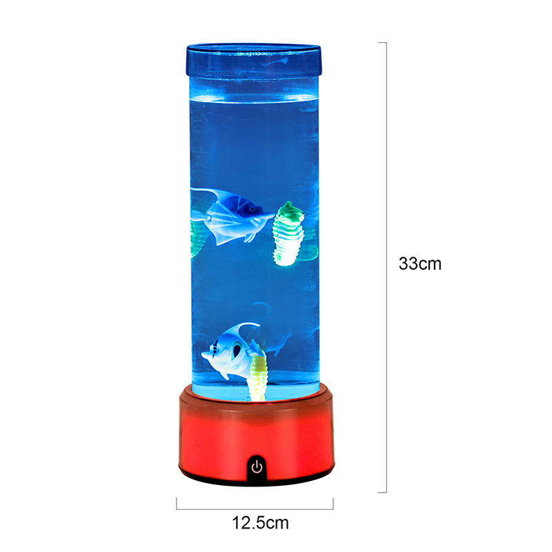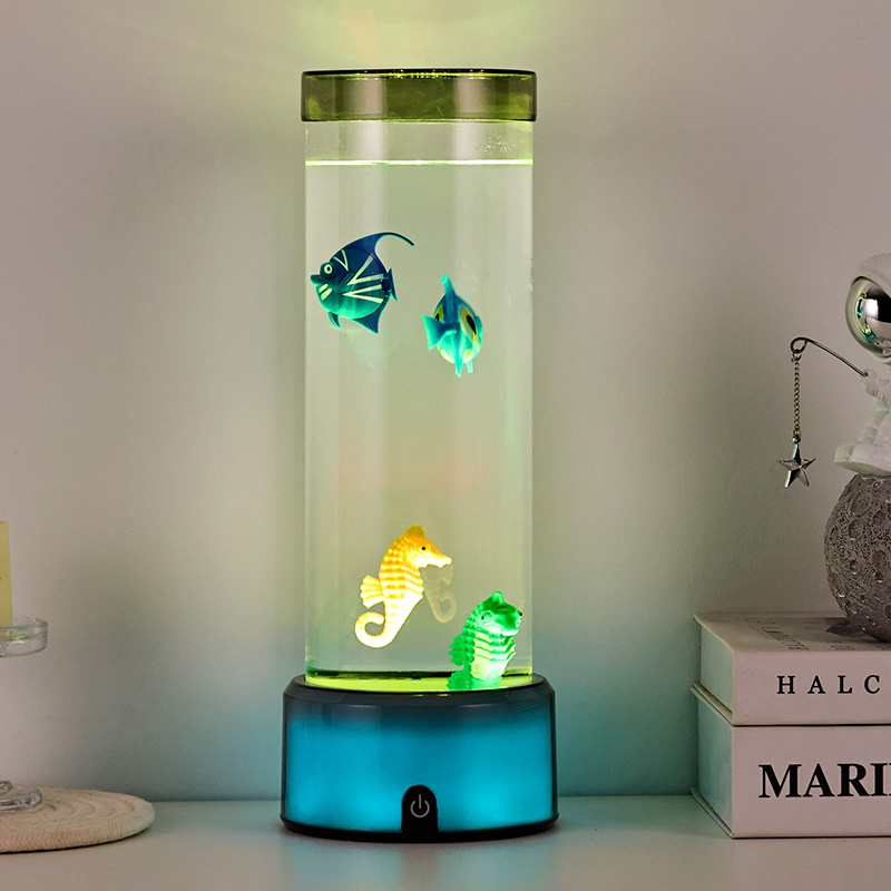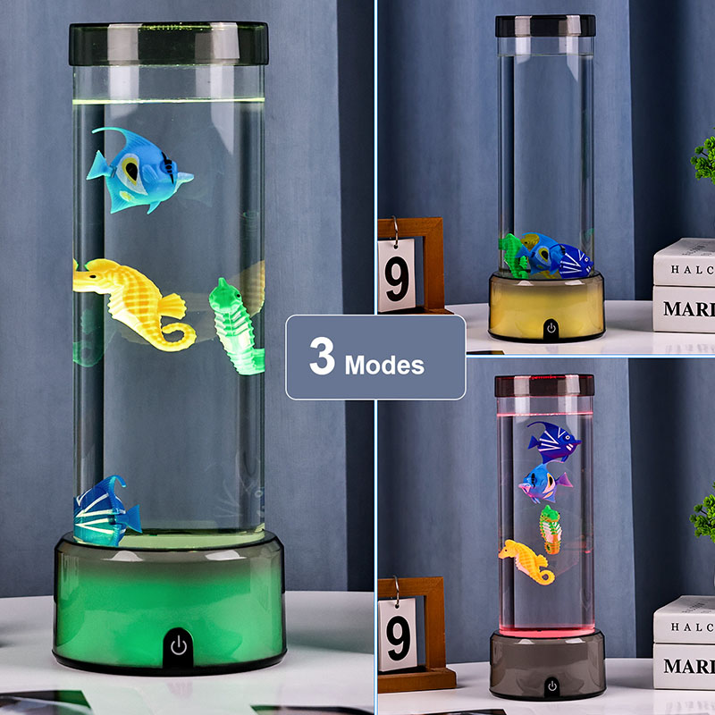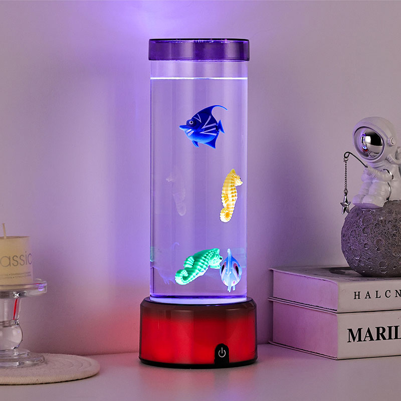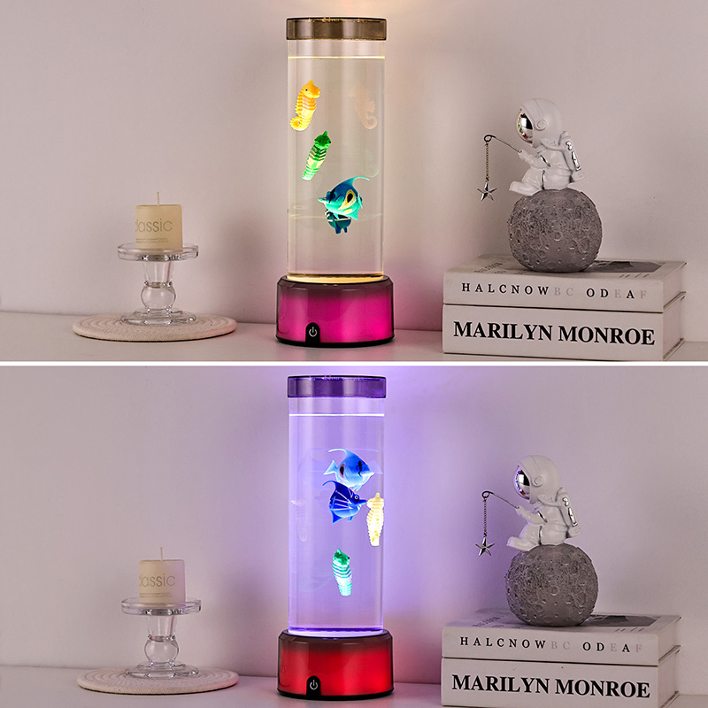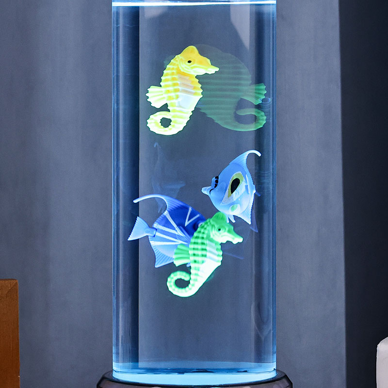 آنها ظاهری واقعی دارند زیرا به آرامی در لوله پر از مایع شناور می شوند. تماشا کنید که آنها در میان تغییر رنگها شنا میکنند، انعکاسهای زیبایی روی سطوح اطراف میتابانند و هر اتاقی را به یک واحه آرام تبدیل میکنند.
