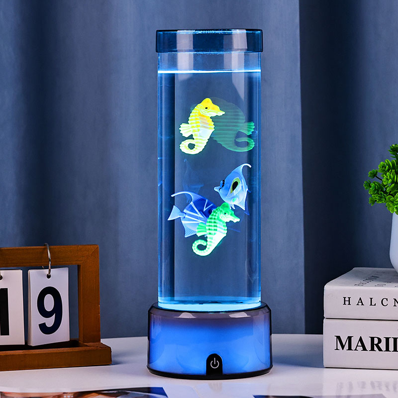 جذابیت این لامپ فریبنده که از پلاستیک باکیفیت و بادوام ساخته شده است، دارای بدنه استوانهای براق مملو از مایع شفاف و ماهیهای شناور با جزئیات زیبا-از جمله ماهیهای گرمسیری پر جنب و جوش و اسب دریایی جذاب- است که منظره اقیانوسی آرام و واقعی را ایجاد میکند که آرامش و لذت بصری را به هر اتاقی میآورد.