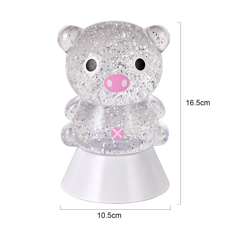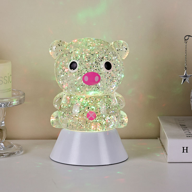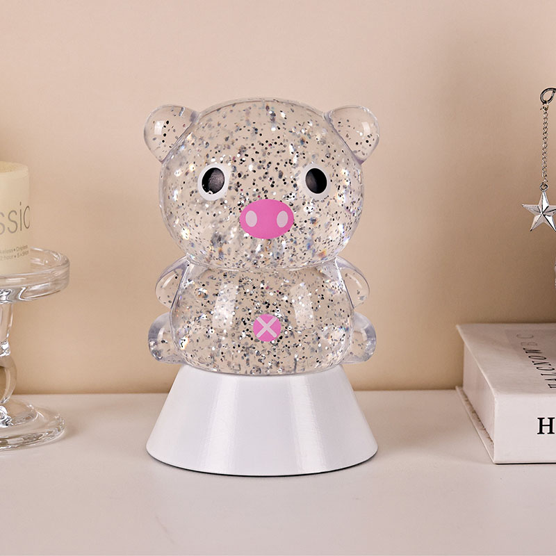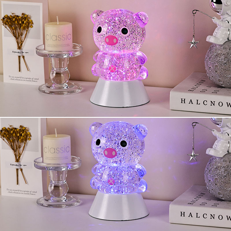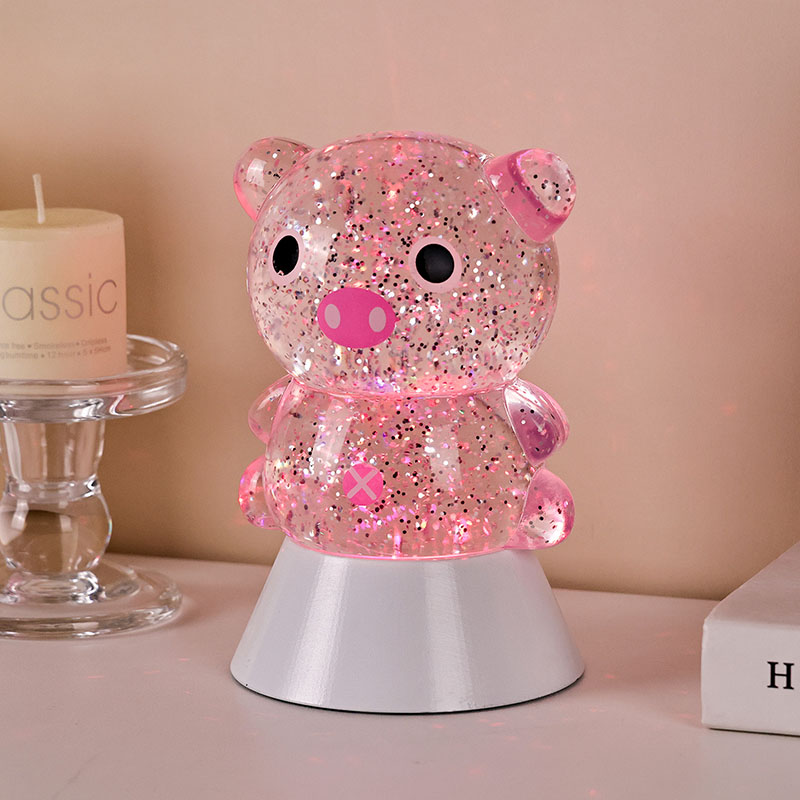طراحی کلی دارای یک تصویر خوک زیبا و شایان ستایش است، با خطوط گرد و چاق آن همراه با چشمان درشت، پوزه صورتی و گوش های کوچک شایان ستایش، که فوراً قلب بزرگسالان و کودکان را تسخیر می کند. پوسته رزین شفاف پر از پولکهای رنگی درخشان و مایع مخصوص است که با روشن شدن چراغها به آرامی همراه با مایع جریان مییابد و جلوه بصری رویایی مانند رودخانهای پرستاره را ایجاد میکند که در بدن خوک جریان دارد. رنگهای روشن بهطور خودکار در چرخههای مختلف قرار میگیرند و از صورتی ملایم و بنفش رویایی به آبی و سبز تازه تغییر میکنند و پیوسته به رنگین کمانی از رنگها تبدیل میشوند که فضایی آرام و در عین حال جادویی ایجاد میکنند، گویی دنیای افسانهها را به واقعیت تبدیل میکنند.