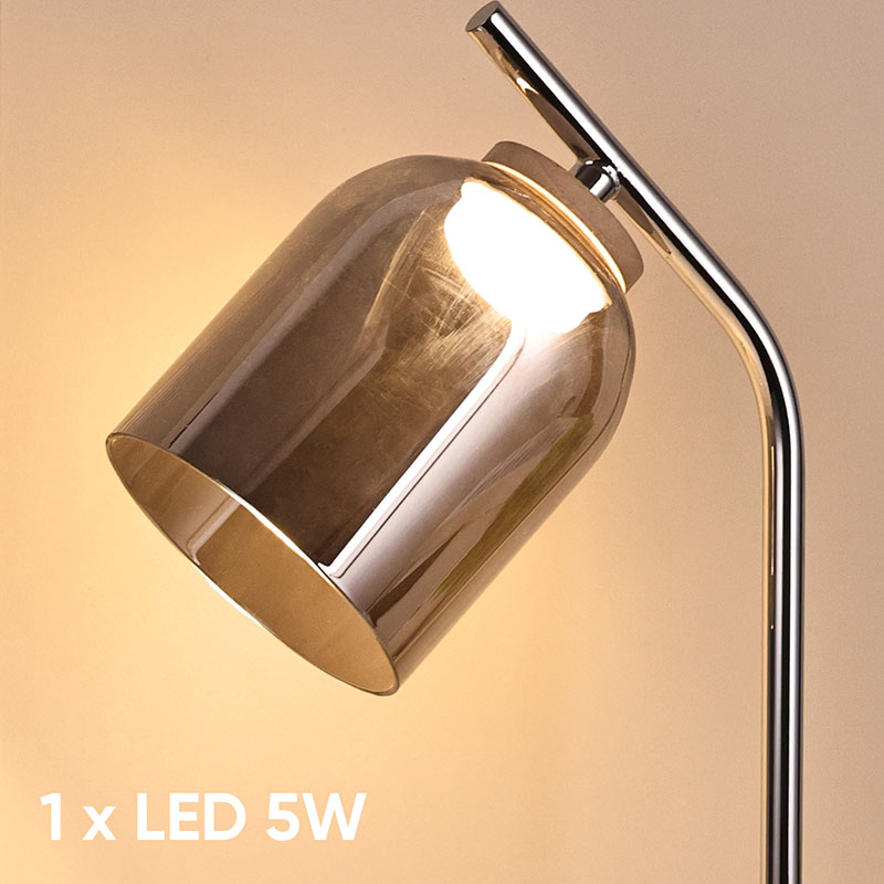 پایه کروم، شیشه دودی (کهربایی).طراحی نوآورانه، مواد شیشه ای، ظاهری با کیفیت و زیبا، سبک طراحی چراغ رومیزی بسیار تزئینی