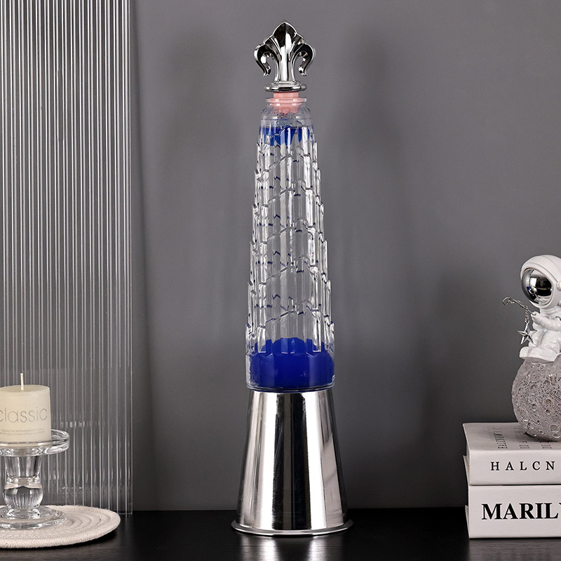 چراغ رومیزی لامپ لاوا سایه برج دارای طراحی کلاسیک به شکل برج، با تزئینات فلزی مشکی رنگی که در بالا، ساده و در عین حال نجیب تعبیه شده است. در داخل بطری شیشه ای شفاف، موم آبی وجود دارد